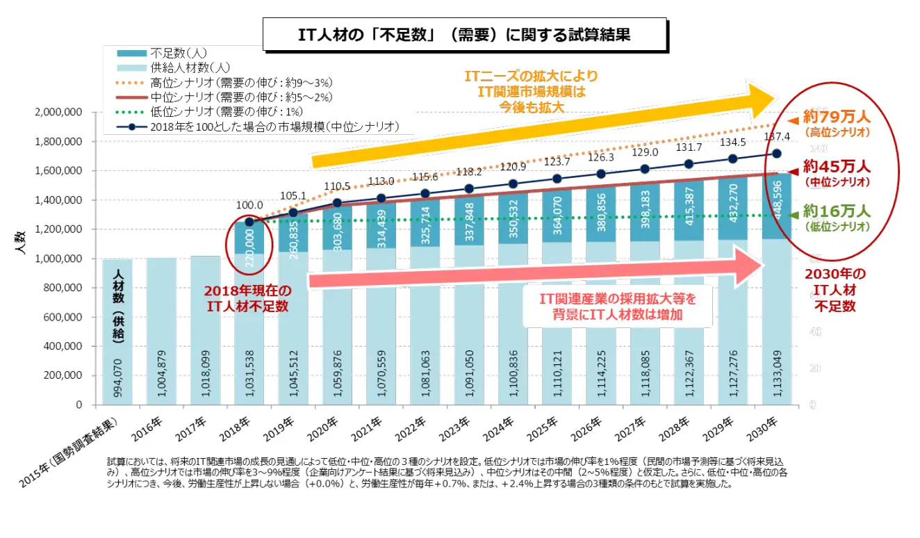 経済産業省の「IT人材需給に関する調査」によると、2030年までに最大78.7万人のIT人材が不足すると予測されています。デザイナーもIT人材の一角であり、この需給ギャップの影響を直接受けています。