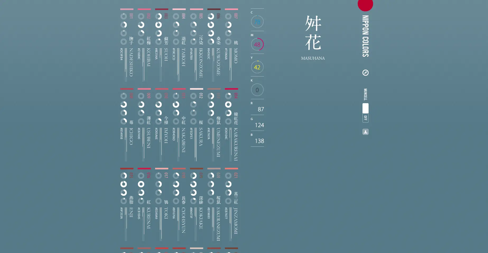 NIPPON COLORSは、日本の伝統色を一覧で確認できるサイトです。「藍色」「桜色」「抹茶色」など、日本らしい色名とカラーコードがセットで表示されます。和を感じさせるデザインや、日本企業らしさを出したい場合に参考になります。