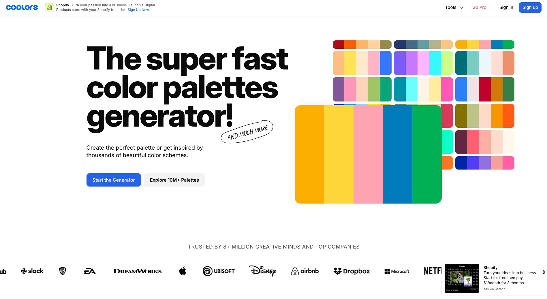 Coolorsは、スペースキーを押すだけでランダムな配色パターンを生成できるツールです。気に入った色はロックして、他の色だけを変更することも可能。直感的な操作で、短時間で多くの配色パターンを試せます。