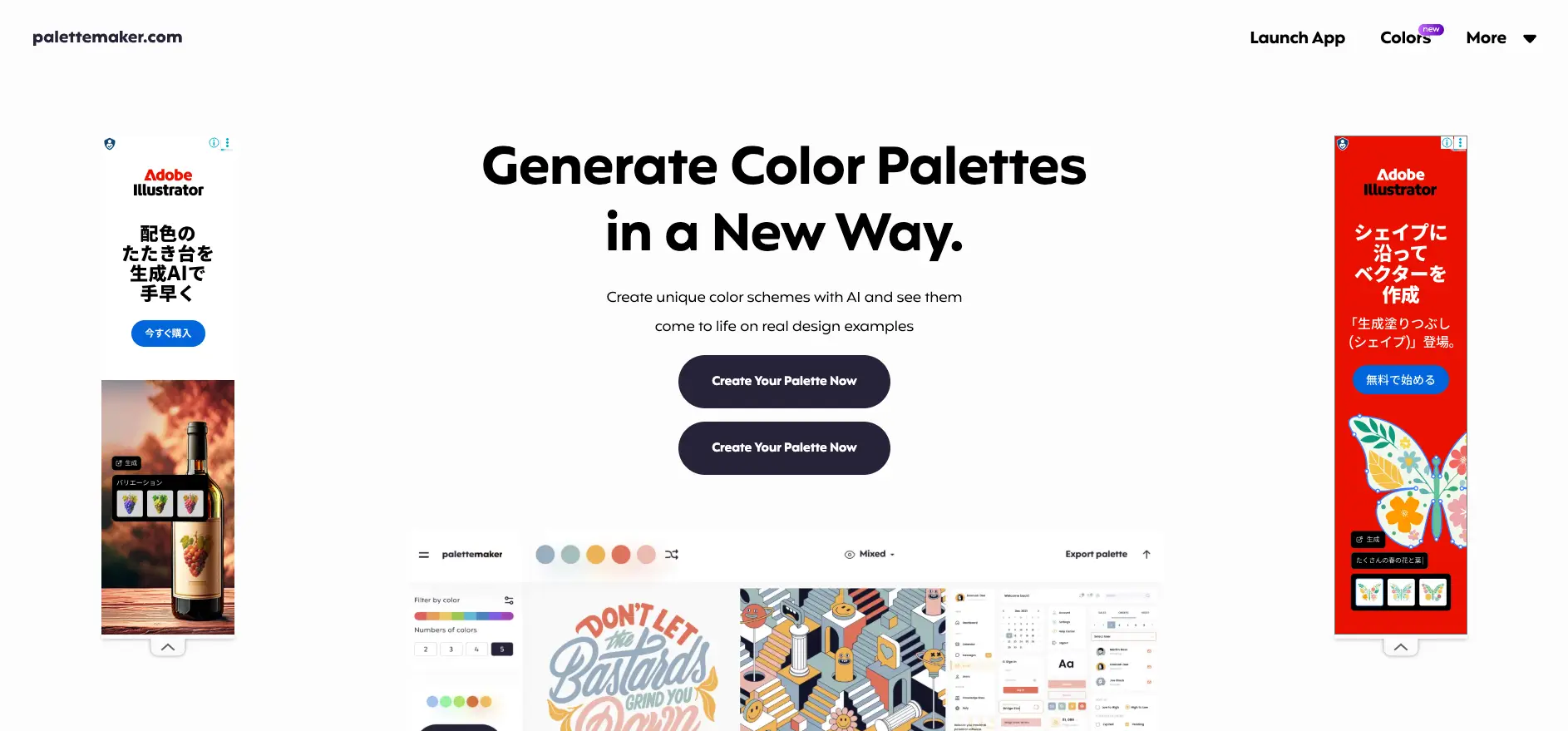 Palettemakerは、作成した配色パターンを、実際のUI(ボタン、カード、フォームなど)に適用した状態で確認できるツールです。Webサイトだけでなく、アプリのUIデザインにも活用できます。