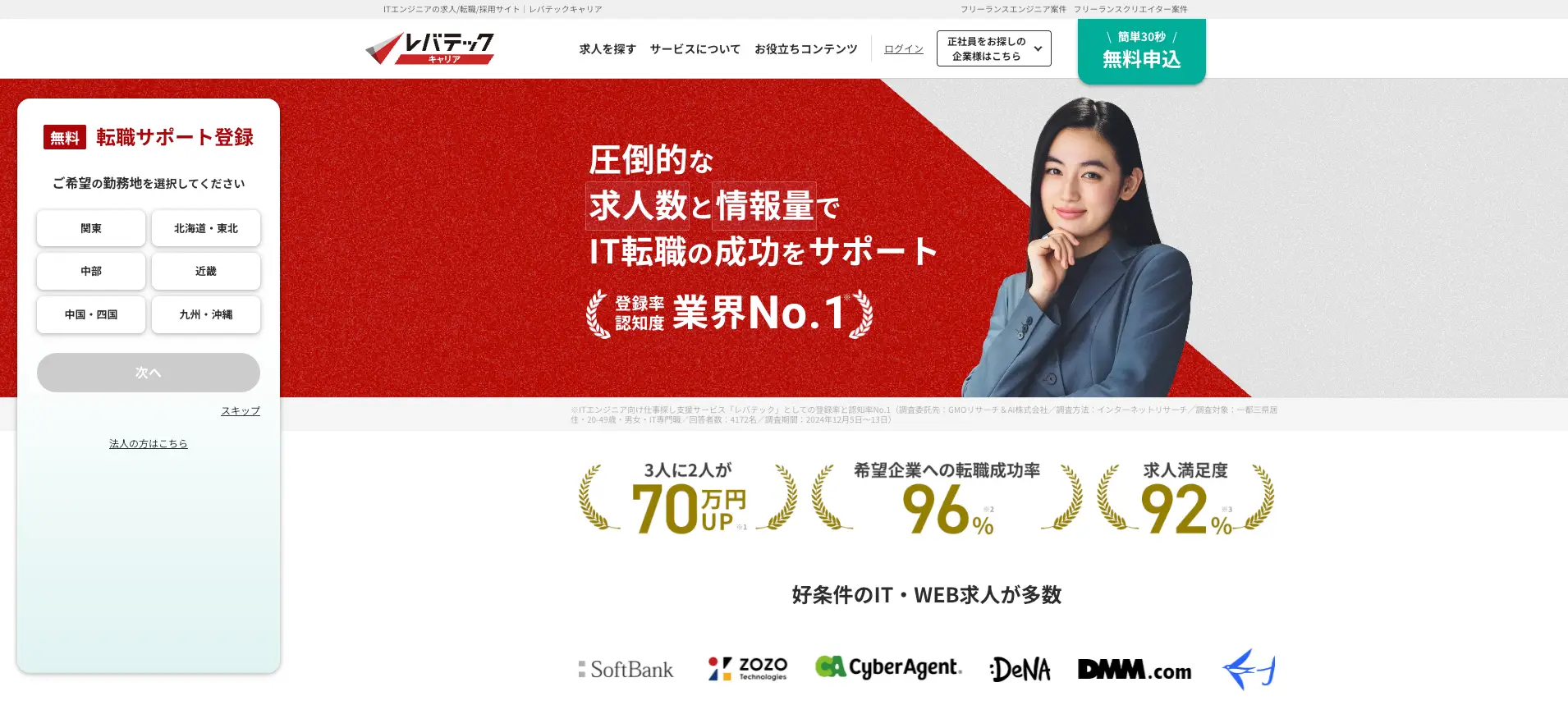 レバテックキャリアは、ITエンジニア・クリエイター専門の人材紹介サービスとして、20年以上の支援実績を持つ老舗エージェントです。