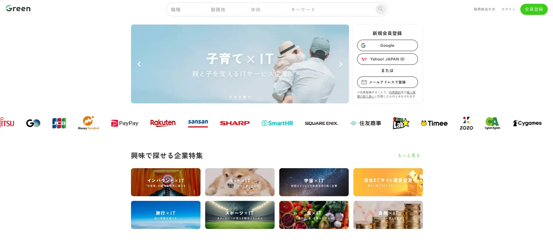 GreenはIT・Web業界に特化したダイレクトリクルーティング型の採用プラットフォームです。エージェントサービスではありませんが、企業の採用担当者から候補者に直接スカウトを送れる仕組みが、採用コストを抑えたいIT企業に支持されています。