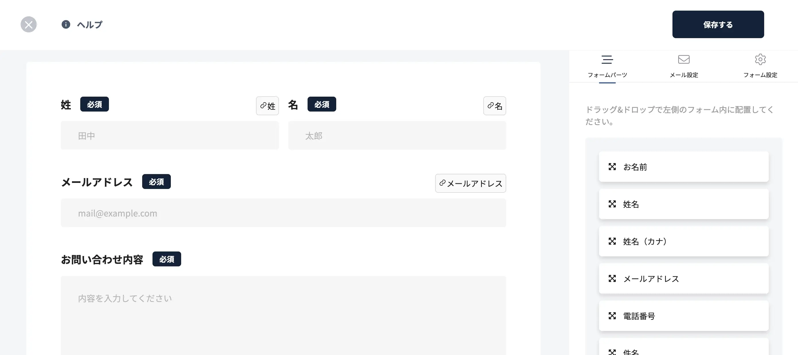 フォームを新規作成する場合、姓・名パーツがデフォルトで設定されるため新たに追加する必要はございません。